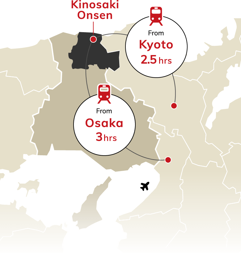 Kinosaki is located 2.5 hours from Kyoto and Osaka. Guests coming from Kyoto and Osaka can use JR Passes to get to Kinosaki Onsen Station.